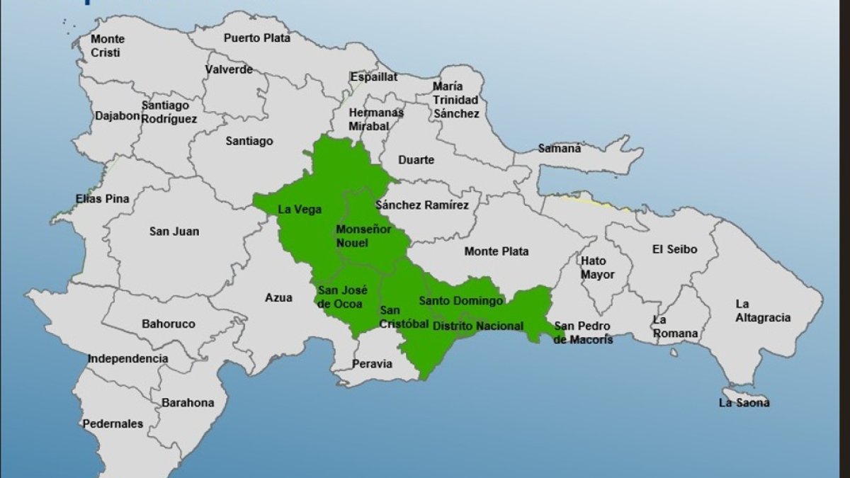Según el último informe oficial, las demarcaciones bajo aviso son Santo Domingo, San Cristóbal, Monseñor Nouel, La Vega y San José de Ocoa.