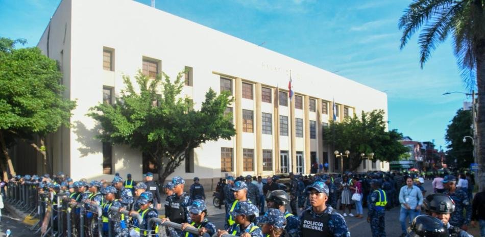 Un impresionante despliegue policial de más de 50 agentes ha tomado las afueras del Palacio de Justicia este domingo, mientras el tribunal decidirá si dicta prisión domiciliaria o preventiva a Santiago Hazim y otros nueve señalados por el sonado caso de corrupción en el Seguro Nacional de Salud (Senasa).