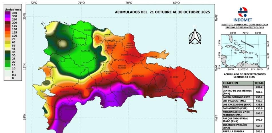Aunque el ojo de Melissa no cruzó por nuestro país, según Font-Frías, ¡sus lluvias fueron torrenciales e históricas del 21 al 30 de octubre! Se registraron acumulaciones récord en Barahona (737.2 milímetros de lluvias), Centro de los Héroes (DN)(507.4 mm), Santo Domingo Este (453.1 mm), Los Prados (DN) (440.3 mm), Los Cacicazgos (DN)(438.8 mm) y San Antonio, San Cristóbal con 436.6 mm.