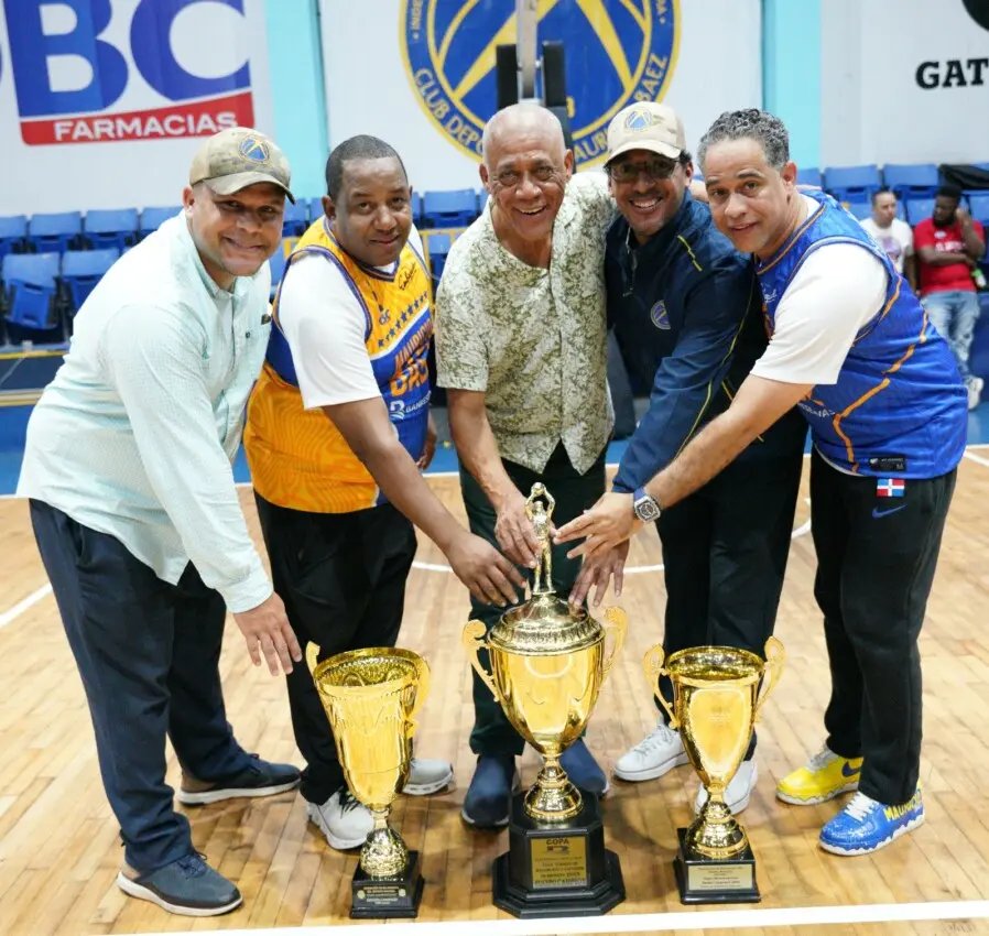 Desde la izquierda, Amaury Heredia, Melvyn López, José -Boyón- Domínguez, César Heredia y Ruddy Martínez posan con las últimas tres coronas históricas obtenidas por el club Mauricio Báez en los torneos de basket superior distrital.